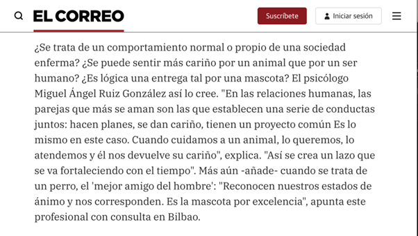 En octubre de 2014, El Correo publicó una pieza divulgativa vinculada a la película Amores perros (Alejandro González Iñárritu), con una lectura psicológica de algunos de los temas que atraviesan el film: la intensidad afectiva, el dolor relacional, la impulsividad y la forma en que las personas afrontan pérdidas, culpa o frustración. En el artículo se cita a Miguel Ángel Ruiz González, fundador de Psicología y Psicoterapia Miguel Ángel.