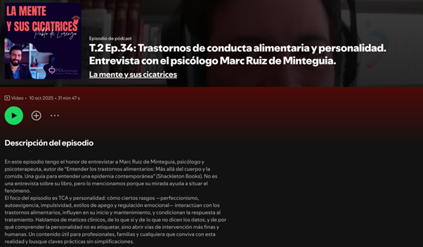 El 11 de octubre de 2025, Marc Ruiz de Minteguía participó en el podcast La mente y sus cicatrices en una entrevista centrada en la relación entre los trastornos de la conducta alimentaria (TCA) y la personalidad.