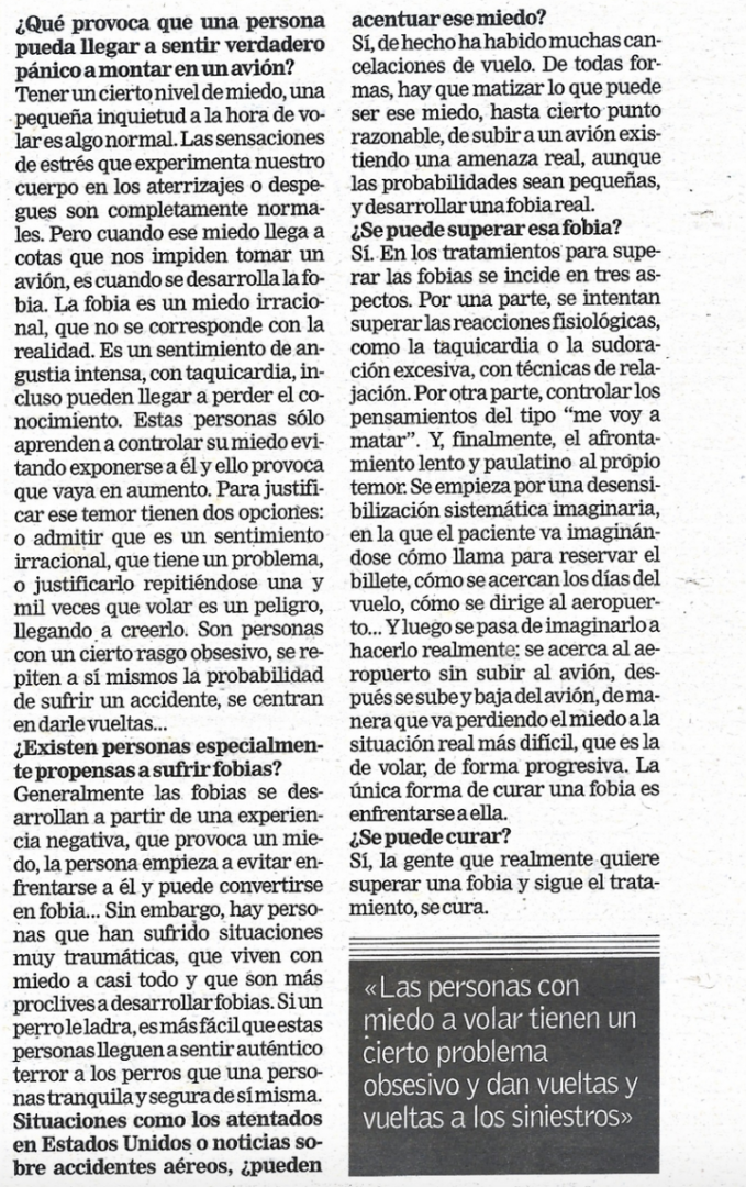 En la entrevista se explican algunos de los mecanismos psicológicos implicados en las fobias, como el miedo a volar, señalando cómo estas pueden desarrollarse a partir de experiencias negativas o del aprendizaje indirecto.